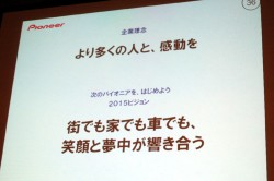 最後に同社は2015年に向けた「次のパイオニアを、はじめよう 2015ビジョン」を発表した。「今日発表した中期事業計画は、そのビジョンへの道筋を示すものと言える」と語る小谷社長。そのキーワードを「街でも家でも車でも、笑顔と夢中が響き合う」と発表した。