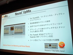 dts Japan(株)は、プロオーディオ用ソフトウェア新製品発表会を本日、D&M恵比寿ショールームで開催した。会場で紹介されたのは2chや5.1ch素材を最大7.1chまでアップミックスして出力できるポストプロダクション、ミキシング業界向けのプラグインソフト「Neural UpMix」とスタジオ向けのエンコーディングソフト「DTS-HD Master Audio Suite」の最新バージョンの2つ。