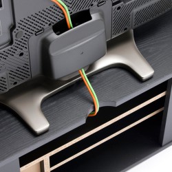 本体背面には配線用のコードホールを設け、スマートな設置が可能だ。底部には見た目に目立たないストッパーを付属した「隠しキャスター」を装備する。
