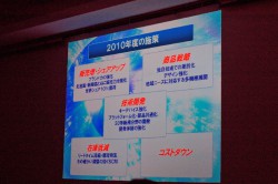 2010年度の具体的な施策としては、CMや店頭訴求などの広告販売強化に加え、独自で開発しているデバイスの進化やデザインの追求、他機種展開などによる商品力の強化、さらに他機種展開に対応できる開発体制の強化も必要であるとし、仙台の開発部門を大宮に移転させたことなど説明した。
