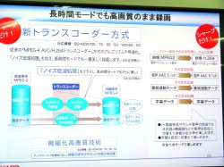 松浦氏は、AQUOSブルーレイの特徴であるMPEG-4 AVC/H.264トランスコーダーについても説明。他社のレコーダーで一般的なエンコーダーと異なり、シャープのトランスコーダーでは、放送で送られてきたMPEG-2の動きベクトルやレート配分データ、AAC 5.1chのサラウンド音声、番組連動データ、字幕データなどをそのまま記録する。これはモードを問わず、10倍AVC録画時でもこれらのデータは記録される。ただし長時間モードの場合は、番組連動データをカットするかどうかを選択することができる。