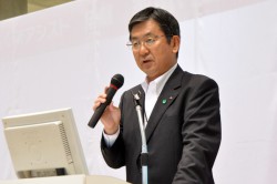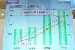 続いて同社京都製作所 所長の阿部正治氏が新製品のテレビについて説明。「国内の薄型テレビ需要は順調に伸びており、中でも録画テレビの比率は急上昇中。2010年度には1,800〜1,900万台の需要のうち25%が録画テレビになると予測している。“3D元年”の到来により、対応ハードやソフトも続々とリリースされていくだろう。新モデルのMDR1シリーズは、この録画機能と3D再生、高画質・高音質機能、そして『らく楽アシスト』機能を備えた“全部入り”モデルと言える。MDR1、BHR400、BHR300の3シリーズを合わせ『録画テレビは三菱』ということで幅広く提案していきたい」と語った。