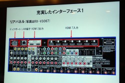 RX-V1067は、定格出力105W×7の7.1ch AVアンプ。HQV最新チップやYPAOの室内初期反射音制御機能などは搭載しておらず、装備するシステム対象をWin7&DLNA1.5ネットワーク機能や、3D&ARC対応部分に絞ることによって、低価格化を実現した。