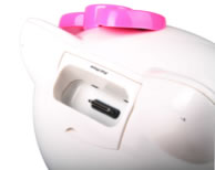 ドック端子はハローキティの後頭部に装備。対応iPodはiPod(オリジナル〜第5世代)、iPod mini、iPod photo、iPod with color display、iPod nano(第1世代〜第5世代)、iPod classic、iPod touch(第1世代〜第3世代)。当然ながら、ドック端子にiPodを装着することでiPodの充電が行える。