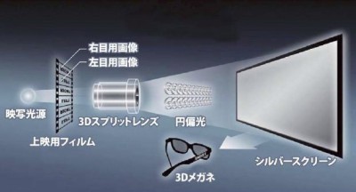 提供を開始するのは、米国のテクニカラー社が開発した「Technicolor 3D」システム。フィルムの1コマを上下に分け、それぞれに左目用・右目用の画像を記録。映写機に装着した専用レンズによって3D映像を映写する仕組みだ。3D映像は円偏光方式で投影されるため、シルバースクリーンが必要となる。