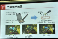 背面にコイルを埋め込んだ3Dディスプレイ(8視差のレンチキュラー方式)を、先端に磁石のついてペン先で触れる。するとカメラがペン先の3次元位置を検出、ペン先が立体映像と同じ3次元位置に来たときに反力が生じる、というしくみだ。