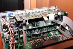 「PR-SC5508」は実用最大出力280W(6Ω)×9chのマルチチャンネルパワーアンプ。筐体内部は、ヒートシンクでパワーアンプ部と電源回路部が分断されている。