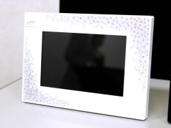 そして本機ではスワロフスキー装飾モデルの「DPF-D720 WI」と「DPF-D720 BU」も用意。ホワイトの「WI」では背景にボタニカルパターンをプリントして大小のスワロフスキーエレメントを散りばめ、草花に朝露が光輝いているような情景をイメージ。ブラックの「BU」では背景にメタルラインを何本もクロスさせ、その上をスワロフスキーエレメントがランダムに連なるデザインで、宇宙空間の流星群のようなイメージに仕上げている。