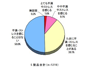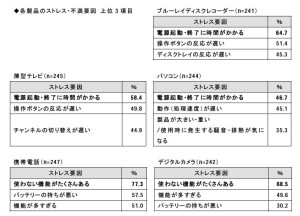 その結果、「不満・ストレスを感じる」との回答が49.8%に上り、デジタル家電購入者の半数が製品に対してストレスを抱えていることが判明。薄型テレビ、BDレコーダー、パソコン購入者は「電源起動・終了に時間がかかる」がそれぞれ最大のストレス要因だったという。また、携帯電話、デジタルカメラでは「使わない機能がたくさんある」が不満点として多かった。