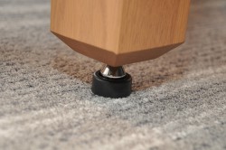 他にもオーディオラックの新製品「ST-T1」(トールサイズ)、「ST-S1」(ショートサイズ)も会場入口に展示している。レッドオークを素材としており、リジッドな構造と優れた制振性能を特徴としている。4本の脚にはそれぞれオーディオインシュレーターが装着されている。木製インシュレーターを採用する同社のアンプ「F1」を設置した際、振動を高効率にアースするようサウンドチューニングが施されているという。8色の仕上げが選べ、オーダーメイドによる受注販売となる。価格は157,500円(税込)。