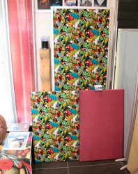 また、グラスウールを用いた吸音パネル「ウォール」も展示。楽器練習など、響きが気になる場所に設置すると吸音効果が得られる。会議室などへの応用も考えられるという。なお、グラスウールには好みの柄を印刷することも可能なので、デザイン性を高めることも容易だ。