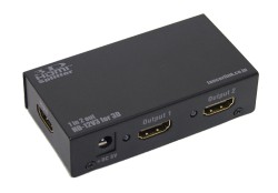 本機は1入力2出力の分配器で、10台までカスケード接続が可能。HDMI Ver1.4規格の3D信号伝送に対応しており、Frame Packing方式の1080p、サイド・バイ・サイド方式の1080i、トップ・アンド・ボトム方式の1080pなどに対応する。