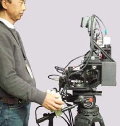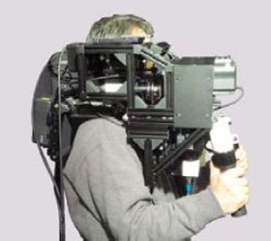 「ビームスプリッター方式ハンディRig」は、使用カメラを小型な「PMW-10MD」専用設計とすることで機材の大幅な小型・軽量化を実現した撮影システム。質量は10kgで、外形寸法は530W×450H×280Dmm(最大部・カメラ、レンズを含む)。固定撮影はもちろん、肩に乗せてのハンディ利用も可能なのが特徴で、移動撮影時などに効果を発揮するとのことだ。