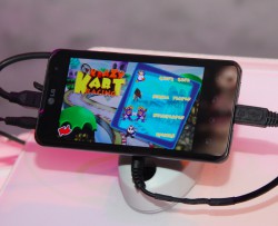 スマートフォンでは、NVIDIAのデュアルコアプロセッサーを搭載した最新モデル「OPTIMUS 2X」に注目だ。ディスプレイは4インチ、800×480ドットで、フルHD動画の再生が可能。同社ブースのデモでは、本機の映像をHDMIでテレビに出力し、ミラーリング表示する機能をアピールしていた。