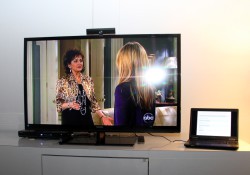 技術参考展示では、テレビのボイスコントロール機能を紹介。手を叩いてから話すと、その言葉通りの操作が行える。現在可能な操作はボリュームの上げ下げ、チャンネルの変更、HDMI入力への切り替えなど。まだ種類は少ないが、増やすことはもちろんできるという。