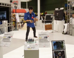 ビクターのブースには36Mbps・1080/60pフルHD動画と高精細静止画の撮影が両方楽しめる“HDハイブリッドカメラ”「GC-PX1」(関連ニュース)の実機展示に注目が集まっていた。3Dビデオカメラ「GS-TD1」(関連ニュース)や、リアルタイム2D/3D変換機能を搭載する「GZ-HM990」(関連ニュース)など、“Everio”新製品もそれぞれにデモコーナーが設けられている。