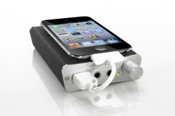 本機は電源にリチウムイオン充電池を採用し、iPhone/iPodと一緒に持ち歩きながら高品位な音楽をポータブルで楽しむことができるヘッドホンアンプ。内蔵バッテリーは残量ゼロの状態から約5時間でフル充電され、約7時間の連続駆動が行える。