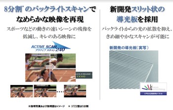 液晶パネルは120Hz倍速駆動に対応。バックライトエリアを47/42V型は上下8分割し、補間映像を1枚はさみながら、高精度なバックライトスキャンを行うことで4倍速駆動相当の動画応答性能を実現する「アクティブスキャン240」も採用し、これにより補間フレームによる残像を効果的に低減している。37V型は5分割のエリアコントロールとなる。従来モデルのZG1/Z1/F1シリーズは上下2分割のバックライトコントロールだった。Z2シリーズではより高精度にコントロールされていることになる。