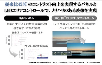 他にも、新たにスリット状に並行配列した導光板をパネルに採用したことで光の拡散を抑え、光の直進性を高めたことも、コントラスト向上につながっている。液晶素材についても、光漏れする分子の数量を低減したことから、より引き締まった黒色が再現できるようになった。色再現性能については、新開発のバックライト専用カラーフィルターを用い、白色LEDの蛍光体を変更して発光波長を変えたことから、HDTV向け色標準規格「ITU-R BT.709」比で99%という色再現性能を獲得している。