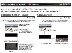 リアルタイム2D-3D変換機能は、ZG1シリーズにも搭載された従来の「ベースライン3D」に加え、新方式の「カラーディテール3D」も利用可能になった。「ベースライン3D」は、1枚の表示フレームの4隅から色ヒストグラムを抽出し、学習・登録された約800枚のサンプル画像と入力映像の「構図」を比較推定。ここから奥行きを割り出した立体モデルをもとに、3D映像を計算していた。ZG2シリーズではこのベースライン処理に加え、フレーム内に表示されているオブジェクトごとに色情報を重ね合わせ、物体の前後位置を判定するアルゴリズムを追加した。これにより、3D表示の際の局所的な凹凸感も再現できるようになり、ディティールに富んだ3D映像を可能にしている。