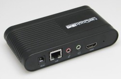 LAN端子の信号をHDMI出力に変換できるアダプター。ギガビットLANに対応するほか、フルHD映像の伝送も可能。PCの画面をLAN内の製品で共有でき、たとえばPCとテレビを本機に接続すれば、PCの画面をテレビに出力できる。