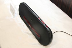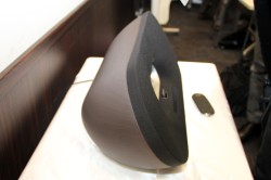 筐体に木材(コットンウッドツリー)を12mm厚で使ったドック付きスピーカー。三次元的な加工で曲面に加工した木材に、ABS樹脂や金属を組み合わせている。曲面デザインを採用することで、定在波の減少も図ったという。本体からはボタンを排除。近接センサーを搭載しておりユーザーが本機に近づくと、バックライト付きコントロールパネルが起動。それを使って操作するしくみになっている。