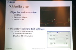 フィリップスのオーディオ製品は、同社の「Golden Ears」と呼ばれるサウンドエキスパートがチューニングを施しているという。この「Golden Ears」の認定試験は、微妙な音の差を聞き分けたり、音の違いを言葉で説明するなどといった約10週間の訓練を経たのちに行われるもの。昨年8月に行われた際は、200人が訓練を受けたが8人しか合格しなかったほど厳しいものであるという。今回発表された新製品はもちろん、2011年夏以降に発売される同社製品はすべて、この「Golden Ears」によるチューニングが施されたものとなる。