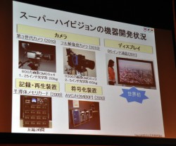 スーパーハイビジョンの機器の開発状況については、フル解像度カメラが昨年に開発されるとともに、800万画素デバイスを使ってSHV相当の解像度を得る「デュアルグリーン方式」を採用し、本体の機動性を重視した重さ20kgの第三世代カメラも開発されている。他にも記録・再生装置、符号化装置の開発も実現されている。