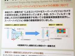 1枚の撮像素子でカラー画像を取得する「単板カラー撮像方式」によるコンパクトなスーパーハイビジョンカメラの試作機も展示。今回は、カラーフィルターを搭載した3300万画素撮像素子を用いて小型撮像実験装置を試作し、スーパーハイビジョン映像の撮像実験を行っている。