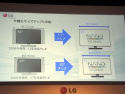 また、55V型で約124cm、47V型で約107cmという製品の横幅にも言及。2006年発売の同社製42V型モデルが約121cm、2005年発売の37V型モデルが約109cmだったことに触れ、狭ベゼル化などを進めてきた結果、全体のサイズを変えずに大幅にインチサイズアップが実現していることも紹介した。