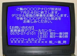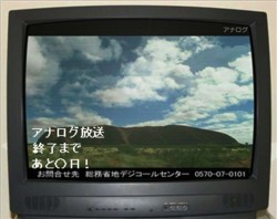 7月1日(金)から7月24日(日)正午まで、アナログ放送のテレビ画面の左下に1/9程度の大きさで、「アナログ放送終了まであと○日」等のカウントダウンスーパーを常時表示。