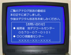 7月1日(金)以降、アナログ放送において、ブルーバックの「お知らせ画面」を定期的に挿入。放送対応の頻度や1回あたりの長さなどは、地域事情に応じて放送事業者ごとに異なる。なお、7月18日(月)以降、総務省地デジコールセンターは24時間運用となる。