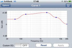 カスタムイコライザーは、周波数帯域のなかに最大14点のポイントを打ち、トーンカーブを調整することができるというもの。作成したイコライザーはいくつでも保存することができる。カスタムイコライザーを適用したい場合は、「Apply」を押し、ドックに挿せばOKだ。
