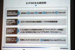 本機はE-P2の後継機。AF機能の向上と、新Live MOSセンサー、新画質処理エンジン“TruePic VI”を搭載した点が大きな特徴。またディスプレイに新たにタッチパネル式有機ELを採用したほか、ボディがフルメタル仕上げになりグリップが着脱式となった点も、前モデルからの大きな変更点となる。