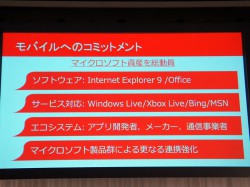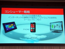 そして「今後はPC用のWindows 7ももちろん“8”に進化させるし、それに加えてWindows PhoneとスレートPCもある。こうした新しい技術をもとにした製品群をシームレスにつないで全体としてサービスを提供していく」と述べた。