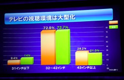 山内氏は同社が行ったBDに関するアンケート調査結果も紹介。テレビの視聴環境では32インチから42インチが7割以上を占め、大型化が顕著になっていること、またBDの購入意向はファミリー層で70%以上を越え、非常に高い数値となっていることを説明した。