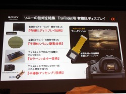 また、新製品群の大きな特徴のひとつである有機ELファインダー“XGA OLED Tru-Finder”については、業務用マスターモニター開発で培った有機ELディスプレイ技術や、高耐圧ドライバーIC開発で培った半導体シリコン駆動技術、デジタルシネマ用カメラ搭載のCCDで培ったカラーフィルター技術、デジタルシネマプロジェクター用パネル開発で培った半導体アッセンブリ技術を結集させたと説明。「従来の電子ビューファインダーに比べて約10倍のコントラスト、高解像度、優れた応答性に加えて、光学ビューファインダーでは実現できないような機能が実現できている」とコメントした。