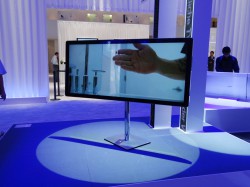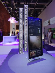 これらのほかにも、“デザインのレーベ”を来場者に強烈にアピールするため、3つのデザインスタディも用意した。「Mirror」は本体を鏡面仕上げにしたスレート型TV。「Module」はテレビ番組などの映像を片方のディスプレイに映しながら、もう一面のディスプレイにTwitterのフィードなどネットの情報を表示し、マルチコンテンツを楽しむことを提案するスタディモデル。「Pivot」ではシネスコサイズの液晶モニターを縦型・横型の表示に切り替え、それぞれの画面レイアウトにフィットしたコンテンツを流せるインフォメーションモニターのような使い方を提案していた。
