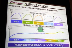 曲調やテンポの近い楽曲を自動的に選曲して、楽曲の盛り上がり部分のみをミックス再生し続ける「ノンストップミックスプレイ」機能を備え、曲を途切れさせることなく音楽を楽しめるのが大きな特徴。曲の盛り上がり部分を検出し、そのテンポや曲調データから、つながりやすい次の曲を自動選曲。スムーズに曲同士がつながるよう、拍を同期してクロスフェードする。クロスフェードする際は自動的にエフェクトをかけ、格好よさを演出してくれる。
