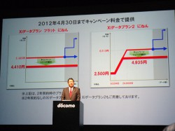また、ドコモでは新たなデータ通信プランを、タブレット発売日の10月上旬より提供開始する。山田氏はこれについて「ユーザーがXiを利用しやすくなるようにした」と説明。新たなプランはフラット型と2段階型で、2年間契約の有無による計4つを用意している。なお、2年間契約の場合は「Xiデータプラン ふらっと2ねん」となり、2012年4月30日までの「Xiスタートキャンペーン」が適用され、キャンペーン期間中は月額4.410円で利用可能となる。なお、同種サービスであるWiMAXとの競合について山田氏は、「高速通信などXiの優れた特性は、WiMAXとちゃんと競合できている。むしろXiの方が優れていると思っている」と語った。