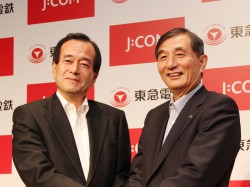 本日行われた会見では、J:COM 代表取締役社長 森修一氏と、東急電鉄 代表取締役社長 野本弘文氏が登壇し、今回の共同買収における概要および今後のCATV事業展開について説明した。