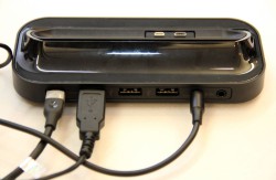 別売りのクレードル「HDステーション」を用意。HDステーションはUSB端子3系統、HDMI出力1系統を装備しており、USBキーボードやマウス、PC用スピーカーなどを複数接続できるほか、ディスプレイへの画面出力もHDMIで行える。