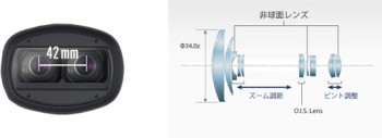 本体には2つのレンズと3MOSセンサー、処理エンジンを搭載した「新3MOSシステム」が採用された点が大きな特徴だ。レンズはF値1.5、虹彩絞りを搭載し、デジタルカメラのLUMIXシリーズで好評を博した「ナノサーフィスコーティング」を施したことで、反射を抑えてゴーストやフレアを低減させている。レンズは広角32mmから320mmの3D光学10倍ズーム機能を搭載した。2D撮影時は広角29.8mmから368.8mmの光学12倍ズーム対応となる。レンズ構成は10群14枚。