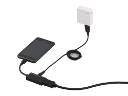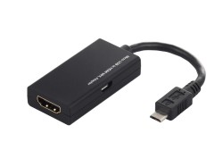 米Silicon Image社が開発した携帯機器向けの高速映像伝送用のインターフェース規格、MHLに対応したスマートフォンをテレビに接続し、スマホ内のコンテンツを大画面で楽しめるようにするアクセサリー。PCやACアダプターと接続して、使用しながらスマートフォンを充電することも可能。