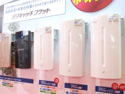 マスプロ電工のブースでは、昨日発売されたばかりの壁面取付用地デジアンテナ“SKY WALLIE”シリーズの新製品「U2SWL20」「U2SWL20B」が展示されている。女性が一人でスムーズに取り付けられるよう、本体形状の小型軽量化を図り、厚さ58mmで質量は既存モデルの半分近い約2.3kgを実現した。