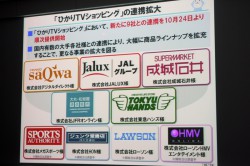 また、昨年9月にスタートした「ひかりTVショッピング」について強化を行うことを説明。「我々が集めるコンテンツだけではお客様のニーズになかなか応えきれない。商材の種類を増やす必要がある」と語り、従来の自主コンテンツと「ジャパネットたかた」のコンテンツに加え、10月24日より順次(株)デジタルダイレクト(イオンサクワ)、(株)JALUX(JALグループ)、(株)成城石井、(株)JFRオンライン(大丸・松坂屋通信販売)、(株)東急ハンズ、(株)メガスポーツ(SPORTS AUTHORITY)、(株)HON(ジュンク堂書店)、(株)ローソン、(株)ローソンHMVエンタテイメントと提携。商品ラインナップを拡充することを発表した。