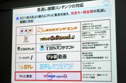 また、見逃し視聴コンテンツも拡充。NHKオンデマンドを筆頭に、在京キー局全局の見逃し視聴に対応するようになった。「当初見込みよりも利用がはるかに多い」とのことで、「2011年度上期1ヶ月辺りの試聴回数は2000万回。約160万人の会員がいるので、平均1人10回以上視聴していることになる。1年前は1,400万回だったので、40%ほど増えている。それぞれのライフスタイルに合わせ、見たいときに見たいものを視聴するという傾向が顕著。午後14時〜18時までと、22時〜0時までの利用がピークとなっている」とのことだ。