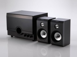 薄型テレビとの接続を想定した2.1chスピーカー。サテライトスピーカーは密閉式で出力が14W+14W、70mm径ユニットを搭載し再生周波数帯域は20Hz〜20kHz。サブウーファーはバスレフ式でユニット径は110mm、出力が13.5W。