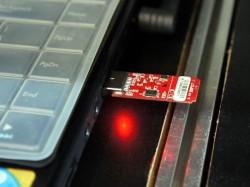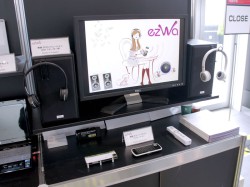 「ezWa」は、SYNCOMM TECHNOLOGY(SYNIC)が開発したロスレスのワイヤレス技術。2.4GHz帯を利用し、1つの送信信号を最大200個までの機器で同時に受信できる。ブースではパソコンからの音楽をスピーカーとヘッドホンで同時に再生するデモを行っている。