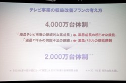 また事業が予定通りに収益を上げられなかった理由については「業界成長に明らかな鈍化が見られ、先進国はマイナス成長に陥った。同時にパネルの調達も供給不足から供給過剰になった。4,000万台体制を目指す方針を策定していた際の前提条件が大きく変化した」とした。さらに「現実問題として、円高ウォン安という為替の問題も大きかった」と付け加えた。